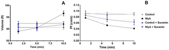 Effects of Suramin on MCV and Pf changes induced by HlyA. RBCs suspensions at 10% hematocrit were used to determine MCV (A) and Pf (B) after 1, 5 and 10 min of HlyA treatment (100 ng/mL). Pf values were calculated, as indicated in Section 4.8, from stopped-flow experiments. Before HlyA addition, cells were pre-incubated in the absence or presence of suramin 100 μM for 10 min at 37 °C. Control experiments were run in the absence of toxin. Points in the plots represent means ± S.E.M. In (A) Control, N = 20; Control + Suramin and HlyA + Suramin, N = 5; HlyA, N = 15. In (B) Control, N = 18; Control + Suramin and HlyA + Suramin, N = 4; HlyA, N = 15.
