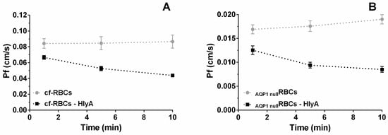 Pf as a function of pre-incubation time with HlyA for control RBCs from frozen samples (cf-RBCs) or AQP1nullRBCs. The plots show the Pf obtained from cf-RBCs (normal RBCs expressing AQP1 that were subjected to the same freeze and thaw procedure as AQP1nullRBCs) (A) or from AQP1nullRBCs (B). Suspensions of RBCs at 10% of hematocrit were pre-treated with 100 ng/mL HlyA (black squares) or without toxin (gray circles) for 1, 5 or 10 min at 37 °C. Then, stopped-flow experiments were performed as indicated in Section 4.7. Pf was calculated as indicated in Section 4.8. Control experiments were run in the absence of toxin (Control and HlyA conditions on both cf-RBCs and AQP1nullRBCs, n = 3). Data are means ± S.E.M.