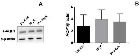 The decrease in Pf observed in Figure 5A could in principle be due to activation of intracellular proteases induced by HlyA [22] which would then proteolyze AQP1 and decrease AQP1 transport. Thus, we performed a Western blot experiment to study the integrity of the AQP1 in RBCs treated with HlyA. Densitometry analysis of AQP1 bands in Figure 6B indicated similar AQP1 protein levels for RBCs exposed to 0 (control) or 100 ng/mL HlyA. Incubation with the inactive toxin ProHlyA provided similar results.
