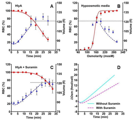 Effects of external osmolarity or HlyA on cell volume and hemolysis of RBCs. RBCs suspensions at 5% hematocrit were employed for experiments. Panel (A). Kinetics of MCV (blue triangles) and hemolysis (red circles) in the presence of 40 ng/mL of HlyA. Hemolysis was measured by the release of hemoglobin (as indicated in Section 4.6.1) and expressed as the proportion (RBC %) of viable RBCs. Volume was measured by electrical impedance cytometry (as indicated in Section 4.9) (N = 4). Panel (B). MCV (blue triangles) and hemolysis (red circles) as a function of media osmolarity (N = 3–6). Panel (C). Kinetics of MCV (blue triangles) and hemolysis (red circles) in the presence of 40 ng/mL HlyA plus 100 μM suramin. The black horizontal dotted line represents the MCVmax achieved in hypo-osmolar media. Values are means ± S.E.M. (N = 3–5). In panels (A,C), the dashed and continuous lines represent the predicted values of MCV and hemolysis respectively, obtained by fitting model 2 to experimental data (see Section 2.7). The dashed and continuous line in panel B represents the predicted values of MCV and hemolysis, respectively, obtained by fitting model 1 to experimental data (see Section 2.7). Panel (D). the plot shows the traces that represent values of ΔOsm vs. time predicted by model 2. The traces were obtained by fitting model 2 to data in Figure 8A,C.