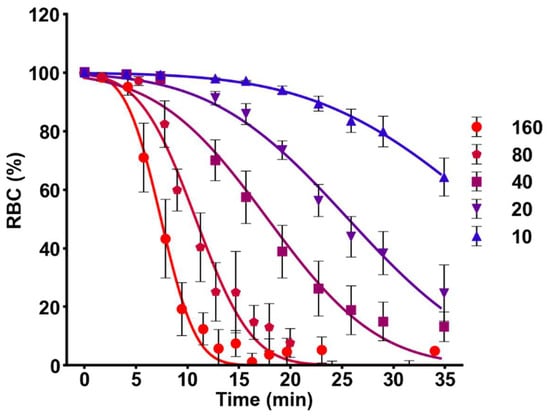 Fitting of time-dependent effect of HlyA on hemolysis. RBCs suspensions at 5% hematocrit were treated for different times with 5 HlyA concentrations (10–160 ng/mL). Data are expressed as the proportion of viable cells (RBC%) vs. time. The continuous lines show the fit of model 2 to experimental data at each HlyA concentration. Best fit values of the parameters are shown in Supplementary Table S1. Data represents means ± S.E.M. (N = 3–6).