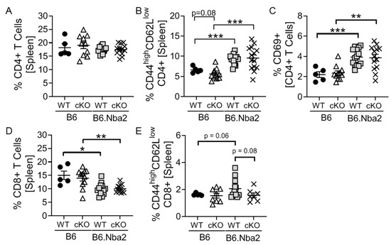2.1. T-Cell Specific IFNAR Deficiency Does Not Affect Splenic CD4 and CD8 T Cell Dysregulation in B6.Nba2 Mice