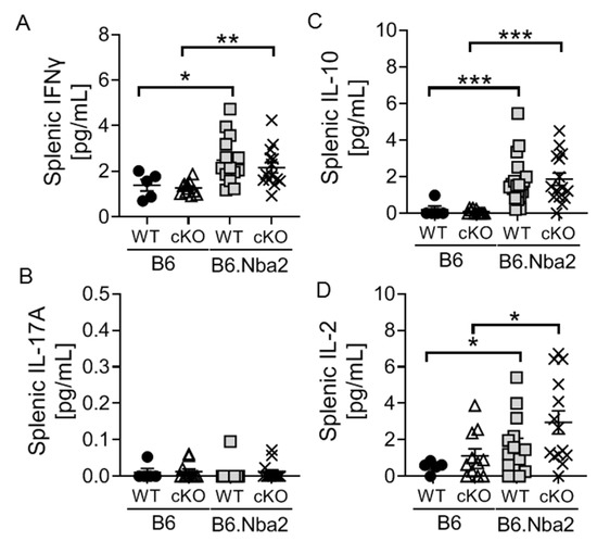 Intrasplenic levels of cytokines are dysregulated in B6.Nba2 mice independent of T-cell specific IFNAR expression. IFNAR-sufficient and -deficient female B6 and B6.Nba2 mice were analyzed for levels of intrasplenic cytokines: IFNγ (A), IL-17A (B), IL-10 (C), and IL-2 (D) as described in Materials and Methods. Each symbol represent one mouse. n = 4–5 (B6), n = 11 (B6 cKO), n = 14 (B6.Nba2), n = 9 (B6.Nba2 cKO). * p < 0.05; ** p < 0.01; *** p < 0.001, Student’s unpaired t-test with Welch’s correction.