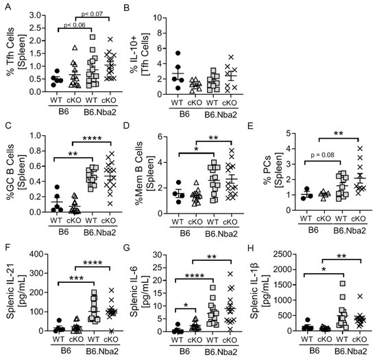 We have previously reported that T follicular helper cells (Tfh), germinal center (GC) B cells, memory B cells and plasma cells are present at elevated levels in B6.Nba2 mice [12,13]. To determine if Tfh cell accumulation was directly dependent on IFNAR expression by T cells, we tested levels in B6 and B6.Nba2 cKO mice. There were no differences in total Tfh cells or IL-10+ Tfh cells between B6.Nba2 WT and cKO mice (Figure 4A,B). Similarly, T-cell specific IFNAR deficiency did not affect levels of GC B cells, memory B cells and PCs (Figure 4C–E). Tfh cells produce IL-21, IL-6 and IL-1β, all cytokines involved in driving the germinal center reaction. As expected all three cytokines were significantly elevated in both WT and cKO B6.Nba2 mice (Figure 4F–H). We did observe a slight increase in intra-splenic IL-6 levels in B6 cKO mice, as compared to B6 WT mice; however, the significance of this observation remains unknown.