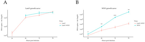 Growth curves of LamV and WNV in U4.4 cells, shown as RNA copies/mL over time. (A) LamV growth curve. (B) WNV growth curve. Dots show the mean RNA copy number per mL with a standard deviation among the biological replicates. * p < 0.05, ** p < 0.01, *** p < 0.001.
