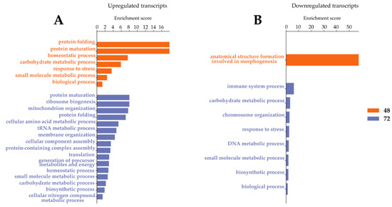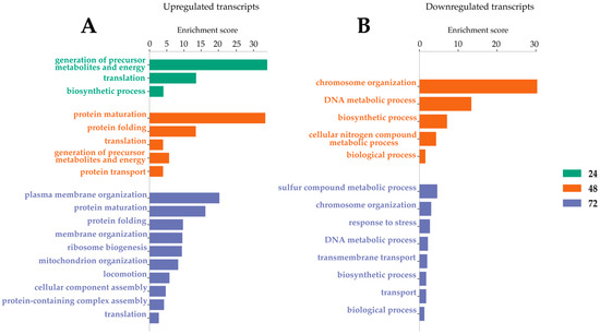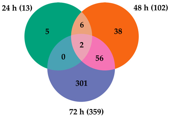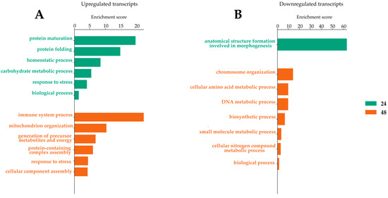The analysis and comparison of mRNA expression profiles of Ae. albopictus U4.4 cells at different time points following LamV infection revealed that 13 (13 up-regulated), 102 (84 up- and 18 down-regulated) and 359 (180 up- and 179 down-regulated) transcripts were significantly differentially expressed (DE) at 24 h, 48 h and 72 hpi, respectively. The comparison of the transcriptome profiles showed two overlapping transcripts among all time points, both coding for the 40S ribosomal protein S21—AALF005471 (7.08–11.38-fold change) and AALF002626 (8–10.94-fold change) (Figure 2 and Table S1). Among the 56 overlapping transcripts between the two later time points (Figure 2 and Table S1), we observed an up-regulation of genes related to protein processes in the endoplasmic reticulum (ER), such as BiP/GRP78 (AALF021835), lethal(2) essential for life protein (AALF005663 and AALF015016), endoplasmin (AALF011939) and Signal peptidase complex subunit 3 (AALF003192). Among the down-regulated transcripts, we observed genes related to DNA replication, such as three DNA helicases (AALF015599, AALF022735 and AALF020651), and DNA replication licensing factor MCM7 (AALF006549). The GO enrichment analysis for biological processes resulted in three, five and ten GO slim terms for the up-regulated transcripts at 24 hpi, 48 hpi and 72 hpi, while the down-regulated transcripts at 48 hpi and 72 hpi resulted in five and eight GO slim terms (Figure 3).