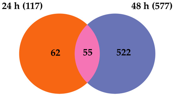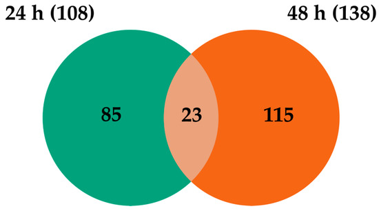 Venn diagram representing the number of differentially expressed transcripts at the different time points of dual-infected U4.4 cells. Timepoints 24 h and 48 h indicate time post-infection with WNV.