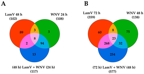 Venn diagram representing the number of differentially expressed transcripts among the different infection groups of U4.4 cells. (A) LamV at 48 hpi, WNV at 24 hpi and the dual infection 48 h post-infection with LamV and 24 h post-infection with WNV. (B) LamV at 72 hpi, WNV at 48 hpi and the dual infection 72 h post-infection with LamV and 48 h post-infection with WNV.