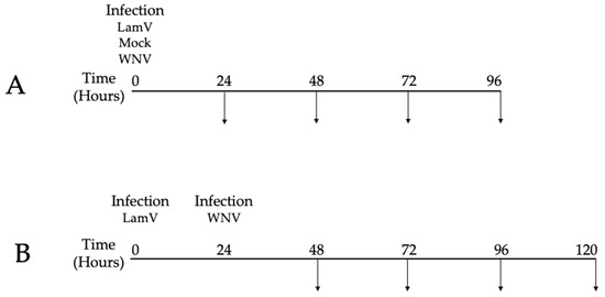 Schematic representation of the experiment schedule. (A) Time scheme for single infections. (B) Time scheme for cells pre-infected with LamV and challenged with WNV. Arrows represent sampling of cells and supernatant. Cells were only collected between the timepoints 24 to 72 hpi.