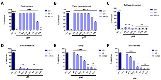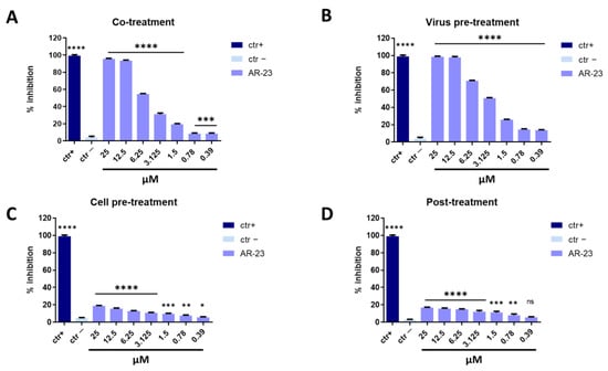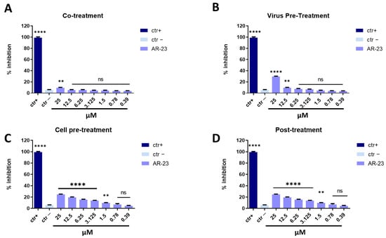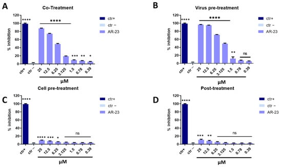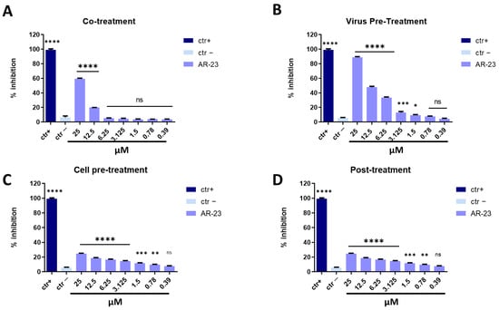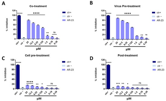 AR-23 showed 60% of inhibition at 25 μM in co-treatment experiments and 50% at 12.5 μM in virus pre-treatment assay against SARS-CoV-2, while it was inactive in cell pre-treatment and post-treatment conditions (Figure 7). Overall, these results suggested that the antiviral activity of AR-23 is generally directed toward the early stages of viral entry.