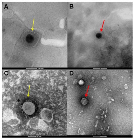 TEM analysis. TEM images of HSV-1 (A,B), as well as SARS-CoV-2 (C,D) virions. In (A), yellow arrows show the untreated HSV-1 particles. In (C), spike proteins of untreated SARS-CoV-2 virions are indicated by yellow arrows. In (B,D), red arrows show naked particles of HSV-1 and SARS-CoV-2, respectively, treated with 25 µM of AR-23.