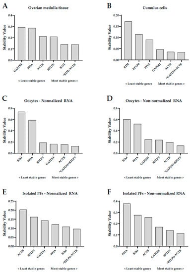 Evaluation of gene expression stability of glyceraldehyde 3-phosphate dehydrogenase (GAPDH), beta-2-microglobulin (B2M), large ribosomal protein P0 (RPLP0), beta-actin (ACTB), and peptidylprolyl isomerase A (PPIA) by the NormFinder software in different human ovarian cells and tissues: (A) ovarian medulla tissue; (B) cumulus cells; (C) oocytes with normalized RNA concentration; (D) oocytes with non-normalized RNA concentration; (E) isolated preantral follicles (PFs) with normalized RNA concentration; and (F) isolated PFs with non-normalized RNA concentration. The genes are ranked from the least (left) to the most (right) stable. * Best combination of two genes.