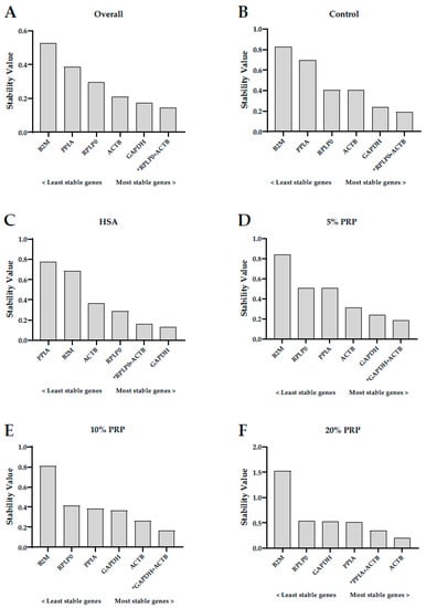 Evaluation of gene expression stability of GAPDH, B2M, RPLP0, ACTB, and PPIA by the NormFinder software in pieces of ovarian cortex after 24 h incubation with different serum-derived products: (A) overall results; (B) control treatment; (C) culture medium supplemented with human serum albumin (HAS); (D–F), culture medium supplemented with increasing concentrations of platelet-rich plasma (PRP; (D) 5% PRP; (E) 10% PRP; and (F) 20% PRP). The genes are ranked from the least (left) to the most (right) stable. * Best combination of two genes.