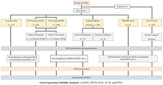 The experimental design is shown in Figure 3. The stability of five of the most commonly used reference genes (RGs) (i.e., GAPDH, B2M, RPLP0, ACTB, and PPIA) was analyzed by the NormFinder software. The study had two arms assessing either the stability of RGs in isolated ovarian cells and tissues or under different culture conditions. In experiment 1, the gene expression stability of the five RGs was analyzed in human oocytes, isolated preantral follicles, cumulus cells, and ovarian medulla tissue. In experiment 2, the stability of the five RGs was assessed in pieces of ovarian cortex after 24 h of culture.