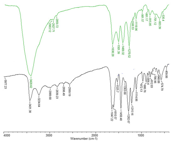 FT-IR spectra (registered in KBr pellets) for CFA (black) and Eu(III)-caffeinate (green).