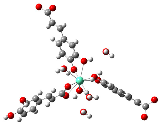 Therefore, we can try to propose a structure for the synthesized Eu(III)-caffeinate, also having as reference the various examples reported of metal complexes with hydroxybenzoic acids. In particular, in the metal complex of Eu(III) with gallic acid, described by Lin et al. [47], both the hydroxyl groups and the carboxyl group of gallic acid are involved in the metal–ligand coordination, but lead to the formation of an interesting 3D metal–organic framework. Another example is the study described by Dan et al. [48] of strontium complexes with dihydroxybenzoic acids. In this case, the complexation of strontium occurs through the participation of hydroxyl groups attached to the aromatic ring. The elemental analysis (EA) of the isolated solid indicated the occurrence of a total of five molecules of water per molecule of metal complex. This result was confirmed by thermal gravimetric analysis (TGA). During TGA two different steps of weight loss were observed: first at 40–110 °C, which we attributed to the thermal dehydration and loss of 2 water molecules (exp 6.32%, calc 5.75%), followed by a second one at 120–220 °C, corresponding to 3 water molecules coordinated to the metallic centre (exp 7.53%, calc 7.48%). On the basis of all of these considerations, we can propose the following structure for the Eu(III)-caffeinate complex (Figure 2), corresponding to the molecular formula [Eu(CFA)3(H2O)3]·2H2O.