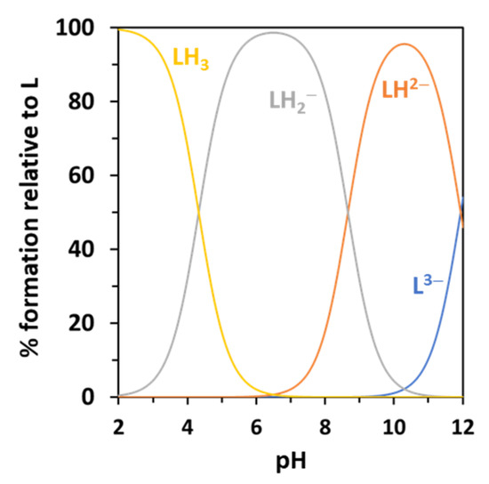 The fully protonated species, [LH3], is the major species at pH < 4, when the deprotonation of the carboxylic acid starts, leading to the formation of [LH2]− species, which is the major species at neutral pH. At pH > 8, the stepwise deprotonation of the catecholate unit starts, being the fully deprotonated species present only in very basic conditions (pH > 11).