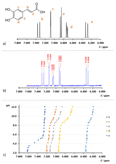 Representation of 1H-NMR titration: (a) 1H-NMR spectra of CFA calculated by ChemDraw software and corresponding peak attribution; (b) experimental 1H-NMR spectra of CFA (cCFA = 10−3 mol·dm−3, pH = 5.7); (c) representation of the chemical shifts of each assigned peak obtained from experimental spectra recorded at different pH values.