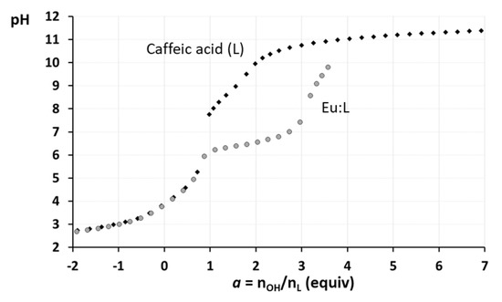 For the study of the Eu3+/CFA system, several independent potentiometric and UV-Vis spectrophotometric titrations were performed, at different Eu:CFA ratios in favour of the ligand, in order to try to enhance the possible formation of EupLqHr(3p−3q+r) species with q > 1. The analysis of the obtained data shows that only 1:1 species are formed in the solution under our experimental conditions. The analysis of the potentiometric curves (Figure 5) shows that Eu3+ coordination by CFA starts at pH > 6, only when the deprotonation of the first catecholate hydroxyl group starts. This is evident by the superimposition of the potentiometric curves of Eu3+/CFA systems onto those of the free ligand. This is partial evidence that the carboxylate group, the first to be deprotonated, is not significantly involved in the coordination of the metal cation. Upon increasing pH, two more protons are subsequently displaced from the catecholate moiety, resulting in EuL type complexes, in agreement with several reported chelation studies of CFA-type ligands [15,56,57]. Furthermore, it is not surprising that the coordination of the lanthanide cation by the catecholate unit is preferred, as a five membered chelate ring is formed; this is a well-known coordination arrangement with higher stability when compared to the four-membered chelate rings that would be formed upon coordination via the carboxylic group.