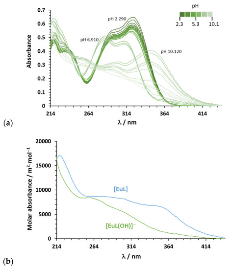 (a) Experimental absorption spectra of Eu3+/CFA system at 1:1 ratio, measured at different pH values, cCFA = 4 × 10−5 mol·dm−3, in I = 0.2 mol·dm−3 KCl(aq) and T = 298.15 K; (b) calculated molar absorbance spectra for the [EuL] and [EuL(OH)]− species.