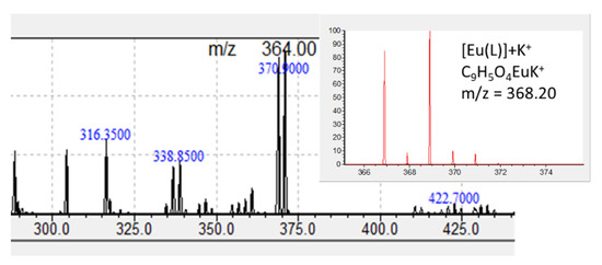 The formation of the [EuL] and [Eu(L)OH]− species was also confirmed by ESI-MS measurements. Several samples were analysed, using different M:L ratios, in both positive and negative polarity modes. On negative mode spectra, a peak at m/z = 178.95 (Figure S4a) was observed, representative of the mono charged species LH2− (C9H7O4−, m/z = 179.16), but also a peak at m/z = 347.00 (Figure S4b), which can be assigned to the [EuL(OH)]− (C9H6O5Eu−, m/z = 346.11) species. The presence of the [EuL] species in the system was confirmed by a signal in the positive mode at m/z = 370.90 (Figure 7), corresponding to the K+ adduct of the mentioned species ([Eu(L)]+K+, C9H5O4EuK+, m/z = 368.20).