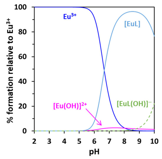 As well as it happens for the ligands, even when studying equilibria involving metal cations, their acid–base properties (i.e., their hydrolysis) must be considered in the speciation model, since many hydrolytic species, including polynuclear and mixed ones [52,53] may be formed, significantly affecting all other equilibria. In the case of Eu3+ (and other Ln3+ ions), the nature and stability of these species is still questionable. While the formation of the first [Ln(OH)]2+ species is nowadays well defined, and its hydrolysis constants may be easily found in literature in a wide range of conditions, few or no reliable data are available in relation to the nature and stability of other species. That is why Ekberg and Brown, who authored one of the most recent compilations of the hydrolysis constants of metal cations [54], suggest to include only the [Ln(OH)]2+ species in the speciation models for Ln3+, and for Eu3+ in particular. Concerning further hydrolytic Eu3+ species (mainly [Eu(OH)2]+ and [Eu(OH)3]), the same authors speculate about the (un)reliability of values reported in literature for their hydrolysis constants, but not about their existence. In agreement with Ekberg and Brown, though we also believe that the formation of further [Eup(OH)r] species is highly probable, and due to the uncertainty about the nature and stability of other Eu3+ hydrolytic species than [Eu(OH)]2+, we followed these authors’ recommendation to consider only the latter species in the model. As such, in this work log we used β10-1 = −8.02, calculated by Klungness and Byrne [55], who accurately investigated the first hydrolysis of several Ln3+ cations within wide ionic strength and temperature ranges.