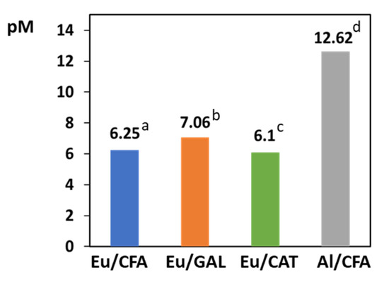 To overcome these questions, several parameters have been proposed. One of these parameters is the pM value, commonly used in biological and medicinal chemistry to compare the affinity of different ligands for a specific metal under physiological conditions. This parameter is well-known and very often used for the comparison of the sequestering ability of different siderophores towards Fe3+ (being indicated as pFe in that particular case). pFe was defined by Raymond et al. in 1979 as −log[Fe3+], [Fe3+] being the concentration of the free aqueous ion [Fe(H2O)6]3+ present in the solution at specific experimental conditions (pH = 7.4, cFe = 1 μmol·dm−3 and cL = 10 μmol·dm−3) [68]. As such, the higher the pM, the lower the concentration of free metal cation, and so, the better the chelation ability. In this work, based on the stability constants determined for our Eu3+/CFA system, we were able to determine the pEu parameter. This can be compared with the pM calculated for the other mentioned systems, using the stability constants reported (in particular, Eu3+/catechol (CAT) [62], Eu3+/gallic acid (GAL) [63], and Al3+/CFA [59]). The results are depicted in Figure 9.