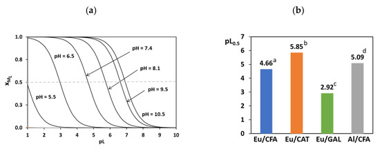 The pL0.5 was then determined for the Eu3+/CFA system, at different pH values, and the individual sequestration diagrams are represented in Figure 10a, while the corresponding pL0.5 values for the chosen comparative systems at pH = 7.4 are shown in Figure 10b. From the diagrams in Figure 10a we can observe that the sequestering ability of CFA towards Eu3+ increases with the rise of pH, this growth being less remarkable at higher pH values. When compared with the same systems mentioned before, the behaviour between the different systems is very similar at pH = 7.4. In terms of absolute values, gallic acid (GAL) generally presents a higher sequestering ability for Eu3+ than the other two catecholate ligands (CFA and CAT), and CFA seems to be a good chelator for both Eu3+ and Al3+ at pH = 7.4.