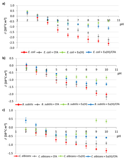 As the interaction with the cellular membrane seems to be the main factor that explains the biological activity of CFA and its Eu(III) complexes, a detailed study was performed in order to obtain further insight into the compound–membrane interactions. This study was performed by electrophoretic mobility, a commonly used technique for surface characterization of nonbiological colloids and, more recently, bacterial, yeast or animal cells [73]. The determination of the surface charge of living cells (δ) is of prominent importance for understanding their behaviour and functions under various environmental conditions. The surface charge values of the E. coli, B. subtilis and C. albicans were measured as a function of pH in 0.2 mol·dm−3 KCl(aq) solutions, containing only CFA or EuCl3, and EuCl3 with CFA at a 1:1 metal to ligand molar ratio (c = 10−3 mol·dm−3), as shown in Figure 11. Briefly, E. coli and B. subtilis were net negatively charged at pH values above their isoelectric points in CFA, Eu(III) and Eu(III)/CFA systems. Furthermore, it is obvious that at low pH values, no statistically significant changes were observed in the δ of membranes of any bacterium placed in the tested solutions compared with the control group (bacterium in the 0.2 mol·dm−3 KCl(aq) only). The effect of the tested compounds on the δ values, due to their specific adsorption on the microbial membrane, becomes more significative as the pH increases. In our studies we observed a decrease in the negative surface charge, with the lowest values for: bacterium + CFA < bacterium + Eu(III) < bacterium + Eu(III)/CFA (see Figure 11). Interestingly, in the case of measurements performed with C. albicans, we obtained positive surface charge values for low pH in the solutions containing Eu(III)/CFA, and at high pH values for the solutions containing only Eu(III). The different membrane response to the presence of the metal complex can explain the lower activity observed against C. albicans when compared with the tested bacteria, in the MIC assays previously described.