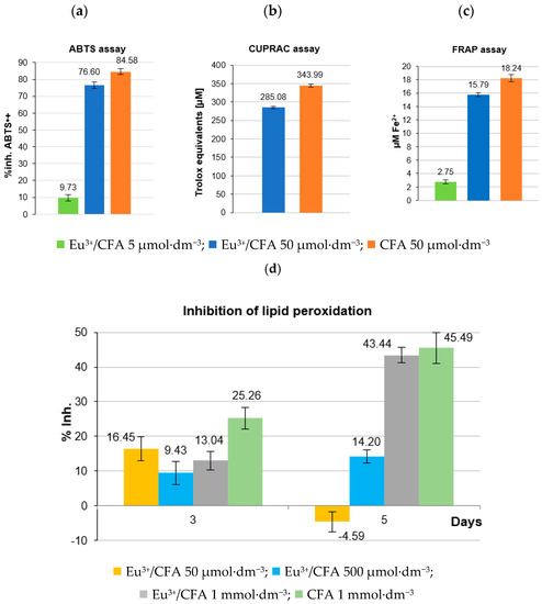 Antioxidant activity assays of CFA and Eu-CFA at indicated concentrations: (a) percentage of inhibition of ABTS•+ cation radicals; (b) results of CUPRAC assays expressed as Trolox equivalents [μmol·dm−3]; (c) evaluation of the reducing ability by FRAP assay; (d) percentage of inhibition of lipid peroxidation by Eu3+/CFA complex at the concentrations of 50, 500 and 1000 μmol dm−3. Mean values from three independent experiments ± SD are shown.