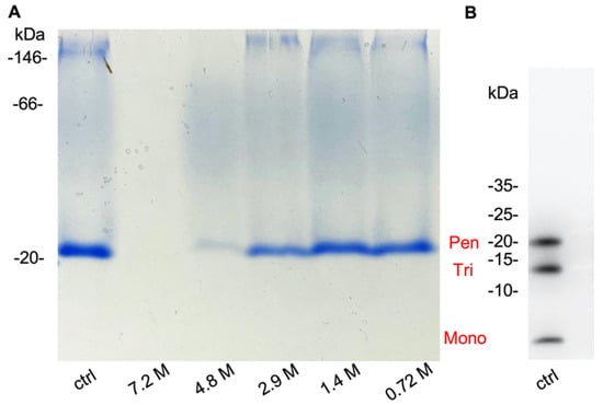 The reliability of Aβ1-42 oligomerization protocol was examined using polyacrylamide gel electrophoresis (PAGE) in both non-denaturing (native) and denaturing conditions. Aβ1-42 oligomeric assemblies were assessed in non-denaturing conditions using blue-native polyacrylamide gel electrophoresis (BN-PAGE) followed by Coomassie Brilliant Blue (CBB) staining (Figure 1A, ctrl). Aβ1-42 oligomeric assemblies were assessed in denaturing conditions using Tricine-SDS-PAGE, followed by Western blot analysis (Figure 1B, ctrl). In native gels, an intense sharp band with an apparent molecular size slightly above 20 kDa was observed; it was consistent with the expected size for Aβp. Faintly stained bands above 146 kDa and a smear between 20 and 146 kDa were also observed. On denaturing gels, oligomers are broken down by SDS, and three bands with apparent molecular sizes of 22.5 kDa, 14 kDa, and lower than 10 kDa were observed (Figure 1B). These bands matched the expected sizes for the Aβ1-42 pentamers, trimers, and monomers. Migration patterns on BN and Tricine-SDS gels were consistent with the results reported previously []. This confirmed that Aβp was the main product of oligomerization seen on BN-PAGE.
