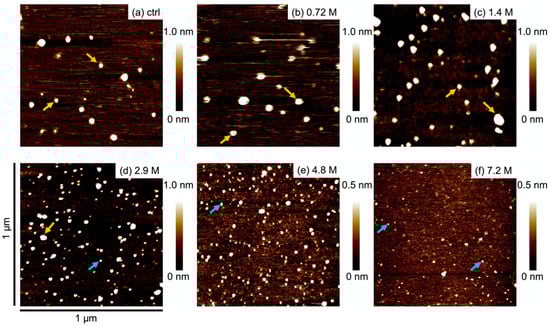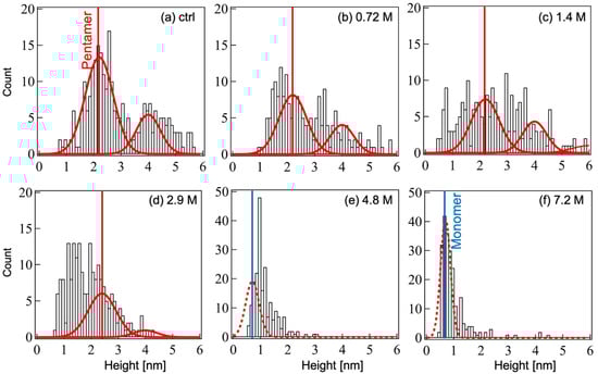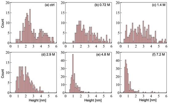 Figure 3 shows the distribution of heights calculated from the AFM contrasts of oligomerized Aβ1-42 after incubation with ethanol. For ethanol concentrations ranging from 0 to 1.4 M, the heights of resolved contrasts are distributed up to 6 nm (Figure 3a–c). When the ethanol concentration exceeded 2.9 M (Figure 3d), most contrasts failed under 4 nm in height, and for concentrations over 4.8 M (Figure 3e,f), the resolved contrasts were typically below 2 nm in height with a dense distribution in the range of 0.4–1.8 nm.