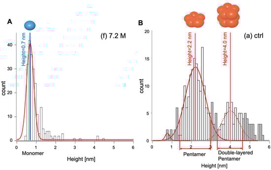In order to quantify distinct types of Aβ1-42 oligomeric assemblies based on their height features, we first characterized the signature feature of the monomeric and pentameric assemblies in the height histogram plot of Figure 3. Therefore, we used Gaussian fitting to resolve overlapping heights of peaks, and then we attempted the identification of Aβ1-42 oligomeric assemblies associated with resolved peaks, as described by Lin et al. []. First, Gaussian fitting was applied to the histogram corresponding to the smallest contrasted spots (Figure 3f); this was obtained at the highest ethanol concentration. The resulting Gaussian fitted curve peaked at a value of 0.690.26 nm (mean standard deviation; Figure 4A). This corresponded to contrasts with heights of 0.5–1.2 nm and widths of 5.0–10 nm that we categorized as monomers. Next, the same procedure was applied to the histogram of Figure 3a corresponding to the largest and highest contrasted spots observed in control condition (without ethanol), which we assumed to be pentamers in regards to BN-PAGE data. Gaussian fitting resolved two curves peaking at 2.2 and 4.0 (Figure 4B). As suggested by Ahmed et al. [], we assumed that there were pentamer and double-layered pentamers, respectively. It is important to note that the monomeric height values observed in this study were consistent with those previously reported for the Aβ1-40 monomer [,]. In addition, single layer and double layer Aβp height values closely matched those reported in previous studies [,,,].