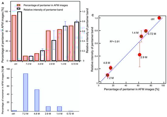 The percentage of pentamers from the AFM resolved height was compared to the 20 kDa band intensity observed by BN-PAGE and was measured by software ImageJ (Figure 6A). Pearson’s correlation coefficient between the ratio of the number of pentamers in the height histograms and intensities of pentameric bands obtained from three independent BN-PAGE gels was 0.91, indicating a strong correlation between the BN-PAGE and AFM results (Figure 6C).