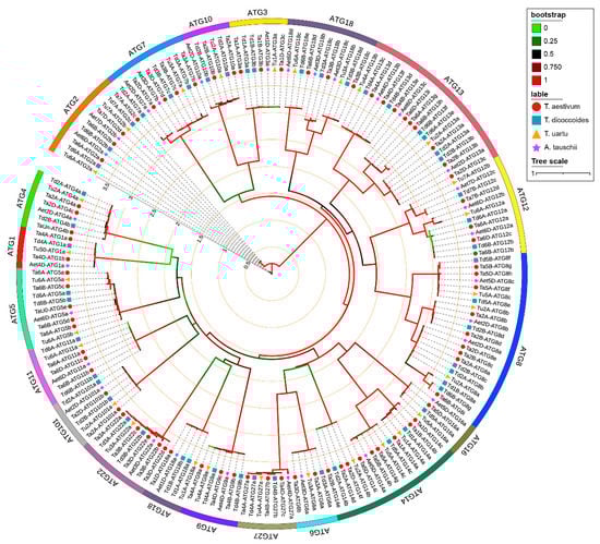Maximum likelihood phylogeny of autophagy-related proteins (ATGs) from wheat (T. aestivum), wild emmer (T. turgidum ssp. dicoccoides), T. urartu and A. tauschii. IQ-TREE software was used to construct a phylogenetic tree of ATGs with the bootstrap value estimation based on 1000 iterations and visualized by iTOL. The names with a solid red circle are wheat ATGs, dark-turquoise square are wild emmer ATGs, yellow triangle are T. urartu ATGs and purple star are A. tauschii ATGs. The Green to red color represents the low to high bootstrap value. All identified ATGs were grouped into 19 clusters (subfamilies).