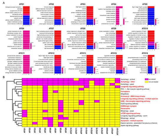Annotation of identified ATGs. (A) GO enrichment of ATGs amongst different subfamilies. The top ten significantly enriched GO terms are displayed. The horizontal axis represents the number of ATGs which are annotated to the displayed GO terms; the vertical axis represents descriptive information of the enriched GO terms. Colors correspond to a value of p.adjust, which turns from blue to red as the p.adjust value changes from low to high. (B) KEGG enrichment of ATGs amongst different subfamilies. The horizontal axis represents autophagy subfamilies; the vertical axis represents descriptive information of annotated KEGG pathways. The fuchsia color denotes that the corresponding subfamily members were annotated in the KEGG pathway and the yellow color means that family members were not annotated. KEGG pathways highlighted by bold red font refer that these pathways can be found in plants.
