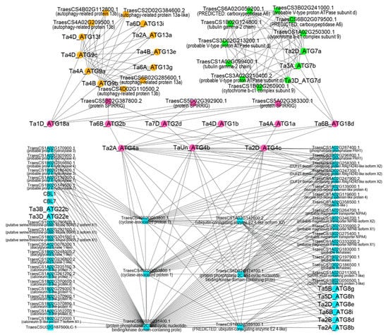 Our results indicated that ATG4 could interact with ATG8 (Figure 3). The finding is consistent with previous studies in Arabidopsis []. In yeast, ATG4 proteolytic activity can be inhibited by ATG1 phosphorylation []. The interaction between TaATG4 and TaATG1 found in the present study suggest that this inhibition may also exist in plants. In Arabidopsis, protein SPIRRIG is essential for salt stress tolerance and endosomal transport routes [,]. Our interact network showed that SPIRRIG interacted with the ATG2-ATG18 complex further along with ATG9 to deliver lipids to the expanding phagophore, possibly improving the salt tolerance of wheat. In addition, close interactions between ATG9 and ATG13 were identified in our network. As a part of the ATG1/ATG13 kinase complex, dephosphorylated ATG13 interacted with ATG9 to stimulate lipids delivery []. PP2C has been reported as crucial in autophagy initiation and multiple abiotic stress responses [,]. Our results suggest PP2C may also be crucial in the crosstalk among TaATG4, Ta6B_ATG18d, TaATG7, and TaATG22 (Figure 3).