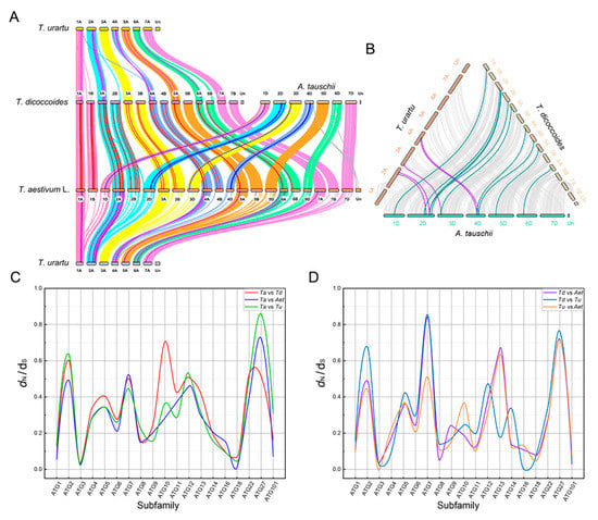 Collinearity relation of four Triticeae species and synonymous (dS) to nonsynonymous (dN) substitution ratio among ATG subfamilies. (A) Collinearity relations of ATGs between every two species are shown in different colors. (B) The collinearity relationship among A. tauschii to T. urartu and wild emmer. (C,D) The dN/dS ratio distribution of wheat and its three diploid and tetraploid progenitors among different subfamilies.