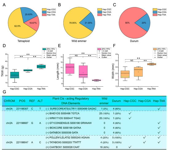 Haplotype-based phenotyping analysis. (A–C) Distribution of three haplotypes (Hap-CGC, Hap-CGA and Hap-TAA) in different tetraploid wheat populations. Three haplotypes located in the promoter region of Ta2A_ATG8a were found and their distribution in different tetraploid wheat populations was diverse. (D–F) Haplotype-based grain character analysis. The association between three haplotypes and grain characters was analyzed. Abnormal value of TKW, corresponding to HAP-CGA, was not considered in testing for significant difference test. ** p < 0.01. (G) Changes of cis-acting elements resulted from SPNs in the promoter region of Ta2A_ATG8a and their distribution in different populations.