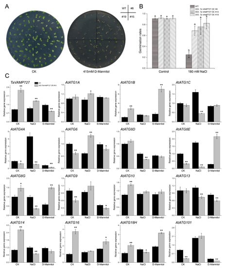 Influence of TaVAMP727 on ATGs in Arabidopsis. (A,B) The germination rate of TaVAMP727 overexpressed lines under either drought (415 mM D-mannitol) or salt (180 mM NaCl) stress. Error bars represent the SD. Columns bars followed by different letters are statistically different according to the analysis of variance followed by Duncan’s Multiple Range Test (control, p = 0.84; 180 mM NaCl, p = 0.0018; n = 3). (C) The expression levels of overexpressed TaVAMP727 and 15 Arabidopsis ATGs were analyzed via reverse transcription-quantitative real-time PCR (RT-qPCR) in both wild-type and TaVAMP727 transgenic line #19 under salt and drought stress. The ubiquitin 5 (UBQ5) (At3G62250) was used as housekeeping genes. Error bars represent the SD. * p < 0.05; ** p < 0.01; n = 3.