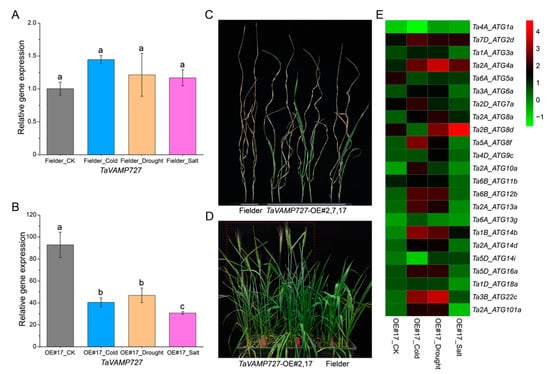 Overexpression of TaVAMP727 in wheat. (A,B) The expression level of TaVAMP727 in overexpressed line and Fielder (WT) under cold (4 °C) for 12 h, air-dry for 6 h and salt (150 mM NaCl solution) for 24 h. Error bars represent the SD. Columns bars followed by different letters are statistically different according to the analysis of variance followed by Duncan’s Multiple Range Test (A, p = 0.1947; B, p = 0.0005; n = 3). (C) Survival rate determination of trileaf stage Fielder and TaVAMP727 transgenic wheat seedlings under drought stress. (D) The heating date comparison of Fielder and TaVAMP727 transgenic lines. (E) The relative expression levels of 23 TaATGs in TaVAMP727 overexpressed line under diverse abiotic stresses. The glyceraldehyde-3-phosphate dehydrogenase (GA3PD) was used as housekeeping genes.