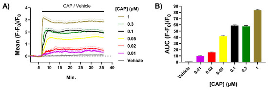 TGNs were prepared and cultured as described in 4.2 but were plated on 13 mm glass coverslips coated with poly-L-lysine and laminin. After 4 DIV, cells were washed with HEPES buffered saline (HBS, mM: 22.5 HEPES, 135 NaCl, 3.5 KCl, 1 MgCl2, 2.5 CaCl2, 3.3 glucose) supplemented with 10 µg/mL bovine serum albumin (HBS-LB) and loaded with 3 µM fluo-4-acetoxymethyl ester (Fluo-4 AM) in the presence of 0.02% pluronic F-127 acid for 20–30 min. at 37 °C. Cells were then placed in a superfusion chamber (RC-25; Warner Instruments, Holliston, MA, USA) mounted on the stage of a Zeiss LSM710 confocal microscope and left for 10 min. with 2 mL/min continuous perfusion with HBS-LB to equilibrate. Confocal imaging was performed at ambient temperature (22 °C) using a 488 nm argon laser and 20× magnification objective (EC Plan-NEOFLUAR/0.5 NA) at 0.33 Hz frame rate. Baseline fluorescence was recorded for 6 min before switching to HBS-LB containing CAP, which was added from 10,000× stock solutions prepared in ethanol on the day of use, and continued recordings in the presence of CAP for 30 min. Control recordings were performed with a vehicle (HBS-LB containing 0.01% (v/v) ethanol). At the end of each experiment, after washing out the CAP or vehicle, TGNs were stimulated with 100 mM KCl in HBS-LB (isotonically balanced by reducing the [NaCl]) to determine the total number of viable Fluo-4 AM loaded TGNs in the image field.