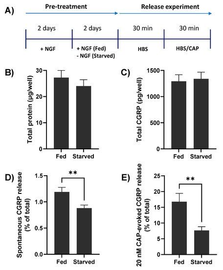 Deprival of NGF for 2 days does not significantly alter total protein or calcitonin gene-related peptide (CGRP) contents of rat cultured TGNs but reduces both spontaneous and CAP-evoked exocytosis of the neuropeptide. (A) Schematic illustrating the experimental protocol. Rat TGNs were cultivated initially in the presence of NGF (50 ng/mL) for 2 days before its withdrawal from half of the wells (starved) or retention for the other cohort over the 4 days (fed). The amounts of CGRP released were quantified during sequential 30 min. exposures, firstly to HEPES buffered saline (HBS) only ((D), spontaneous release), and then to 20 nM CAP in HBS (E). At the end of experiments, cells were solubilised with 1% (v/v) Triton X-100 in HBS, then total protein (B) and CGRP contents (C) were determined, as detailed in Materials and Methods. Data are presented as mean + s.e.m., n ≥ 12, N = 3. Asterisks summarise the results of unpaired t-tests with Welch’s correction, ** p < 0.01, shown only for significant differences.