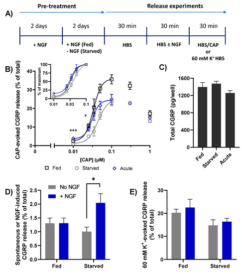 NGF withdrawal for 2 days from cultured TGNs reduces CGRP release stimulated by CAP; acute NGF induces exocytosis and enhances that stimulated with low [CAP]. (A) Timeline for pre-treatment and experimental manipulations of TGNs to determine the effect of NGF starvation and its brief re-introduction (100 ng/mL) on CGRP release under requisite conditions. (B) Dose-response relationship between [CAP] and CGRP release expressed as a % of total. Asterisks show significant differences between starved and NGF acutely treated cells (* p < 0.05, *** p < 0.001, n = 8, N ≥ 3, one-way ANOVA followed by Bonferroni’s post hoc test). Insert: The data obtained with 0.01–0.1 µM CAP replotted as a % of the requisite maximum release evoked by 0.1 µM. (C) Total CGRP contents. (D) Spontaneous or NGF-induced CGRP released from fed and starved cells (as indicated on abscissa) during the second of three 30 min. periods during which they were exposed to HBS only (grey bars) or HBS containing 100 ng/mL NGF (blue bars). Exposure of starved (but not fed) cells to NGF induced a significant increase in CGRP release (* p < 0.05, n = 9, N = 3, unpaired two-tailed Welch test). (E) In separate experiments, TGNs were incubated for 30 min. with/without NGF and then stimulated with 60 mM K+ HBS. Data is presented as mean + s.e.m.