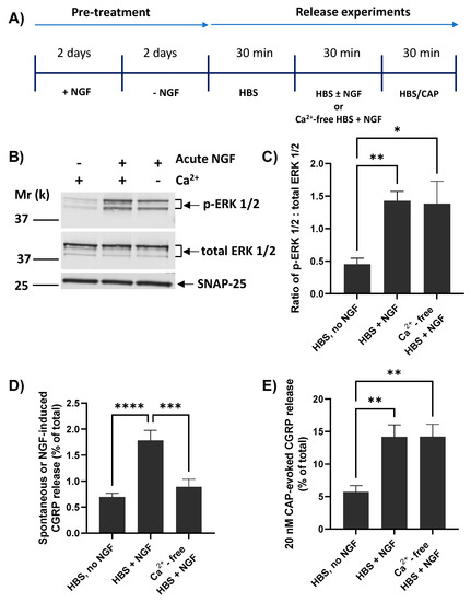 Whilst CAP-evoked CGRP release from cultured TGNs is strictly dependent on the presence of extracellular Ca2+ [37], it seems that this is not the case for the enhancement by brief exposure to NGF of CAP-evoked TRPV1 currents and [Ca2+]i accumulation [17,42]. Thus, the pertinent question of whether NGF-induced CGRP release requires Ca2+ was addressed using the protocol in Figure 4A. As described previously, TGNs were NGF starved before measuring spontaneous release (during the first of three 30 min. incubation periods) and then split into three cohorts. Two of these were exposed during a second 30 min. period to NGF, one of them in the presence of Ca2+ whilst the other was incubated without added Ca2+ and with 2 mM EGTA included to chelate any traces. The third batch was incubated without NGF but with Ca2+. After completing the latter stage, all three were then stimulated (a third 30 min. incubation) with 20 nM CAP in the presence of Ca2+ (which, as noted above, is essential for triggering CAP-evoked CGRP release). The absence of Ca2+ during acute exposure to NGF did not prevent its induction of ERK1/2 phosphorylation (Figure 4B). Indeed, a ~three-fold increase in the ratio of p-ERK1/2: total ERK 1/2 was observed relative to the proportion in continuously-starved cells (p = 0.02; Figure 4C), confirming effective activation of the NGF-TrkA signalling pathway. In fact, the latter ratio obtained in the absence of Ca2+ was indistinguishable from the proliferation of p-ERK 1/2 induced by NGF in the presence of Ca2+ (Figure 4C). By contrast, the absence of Ca2+ abolished the NGF-induced small increase in CGRP release relative to the spontaneous level (Figure 4D). Despite this, an approximately two and a half-fold enhancement by NGF of 20 nM CAP-evoked Ca2+-dependent CGRP release remained unaffected by the presence or absence of Ca2+ during the 30 min. that the cells were exposed to the neurotrophin (Figure 4E).