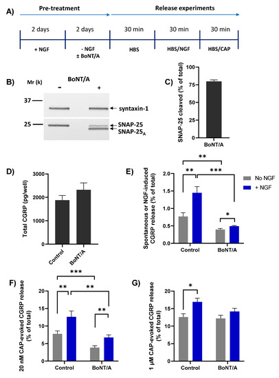 BoNT/A blocked NGF-induced CGRP release and -enhancement of 20 nM CAP-evoked CGRP release. (A) After 2 days in the presence of 50 ng/mL NGF, TGNs were starved of the neurotrophin as detailed before, without or with the inclusion of 100 nM BoNT/A during this latter step. The release experiment was performed as described in Figure 3A. (B) At the end of the protocol, one well each of BoNT/A-treated and non-treated cells were solubilised in 1× LDS and subjected to Western blotting. PVDF membranes were cut horizontally midway between the 25 k and 37 k molecular weight markers. The upper portion was exposed to antibodies reactive with syntaxin-1 (mouse monoclonal, 1:2000) and the lower piece probed with an antibody recognising both intact and BoNT/A-truncated SNAP-25 (mouse monoclonal, 1:3000). (C) The amount of cleaved SNAP-25 in BoNT/A-treated cells was calculated as a % (mean + s.e.m., N = 3) of the total SNAP-25 (intact + BoNT/A product). (D) Total CGRP (pg/well). (E–G) Histograms showing: (E) spontaneous CGRP release during the second 30 min. incubation into HBS without (grey bars) or induced by 100 ng/mL NGF (blue bars), (F) during the third period evoked by 20 nM CAP (minus the spontaneous release), and (G) during the third incubation with 1 µM CAP minus the spontaneous release. In all cases, CGRP release is expressed as a % of total CGRP (mean + s.e.m., N = 3, n = 9). Asterisks summarise the results of unpaired one-tailed Welch tests applied to the data plotted in panels E, F, and G, * p < 0.05, ** p < 0.01, *** p < 0.001.
