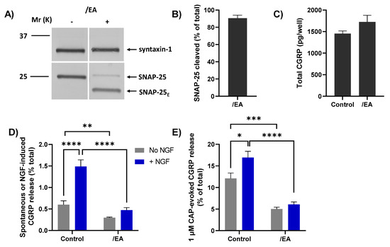 Chimera/EA effectively inhibits 1 µM CAP-evoked CGRP release from starved TGNs, and its enhancement by NGF. TGNs were starved and incubated with 100 nM/EA using a protocol identical to that described previously for BoNT/A (Figure 5A). (A) Western blotting with anti-SNAP-25 antibodies confirms the disappearance of intact SNAP-25 and the appearance of a much faster-migrating product in cells exposed to/EA (+) but not control (−). (B) Histogram displaying the % of SNAP-25 cleaved, which was calculated as in Figure 5C. (C) Total amounts (pg/well) of CGRP, determined as before, in control and/EA-treated cells. (D) Amounts of spontaneous CGRP release (% total) into HBS only, (grey bars), and that during incubation with 100 ng/mL NGF (blue bars), and (E) upon stimulation with 1 µM CAP (minus the spontaneous release) (mean + s.e.m. N = 3, n = 9). Unpaired one-tailed Welch test was applied to the data plotted in panels (C–E), * p < 0.05, ** p < 0.01, *** p < 0.001, **** p < 0.0001.