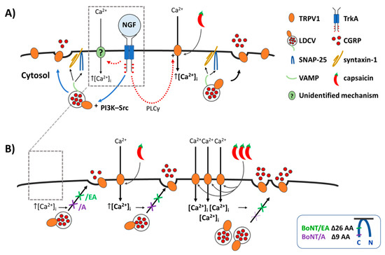 NGF induces a minor increase in Ca2+- and SNARE-dependent CGRP release, whereas it greatly enhances the CAP-evoked exocytosis which is blocked by BoNT/A and/EA at low [CAP] but only abolished by BoNT/EA at higher [CAP]. (A) Illustrates the effect of acute NGF on CGRP exocytosis from control neonatal rat TGNs starved of the neurotrophin for 2 days, and (B) in TGNs pre-treated with BoNT/A or /EA. (A) NGF binds to its receptor TrkA, activates the signalling cascades shown [18], and induces Ca2+ influx by an unidentified mechanism (?). Elevated intracellular Ca2+ ([Ca2+]i) triggers the fusion of large dense core vesicles (LDCVs) via SNARE-complexes (VAMP, syntaxin-1 and SNAP-25), thereby, causing exocytotic release of CGRP and surface delivery of vesicle constituents. This acute potentiation by NGF can involve the phosphatidylinositol 3-kinase—Src (PI3K-Src) pathway, which promotes trafficking of LDCVs, and insertion of their TRPV1 channels into the plasmalemma by Ca2+-regulated exocytosis (blue arrows) c.f. [18,21]. Additionally, the phospholipase C γ (PLCγ) cascade leads to sensitisation of TRPV1 already on the plasmalemma (red dashed arrows) [18]. The outcome of these composite influences of NGF on TRPV1 is that when the channel is activated by CAP [Ca2+]I is raised even more than normally [15,18,21] and this further enhances CGRP release (Figure 2). (B) The proteases of BoNT/A and/EA delete 9 (purple arrow) and 26 (green arrow) residues from SNAP-25 (Insert), respectively, preventing the fusion of LDCVs; this blocks the minimal CGRP exocytosis elicited by NGF (arrow with crosses, left) and its enhancement of the release evoked by 20 nM CAP (