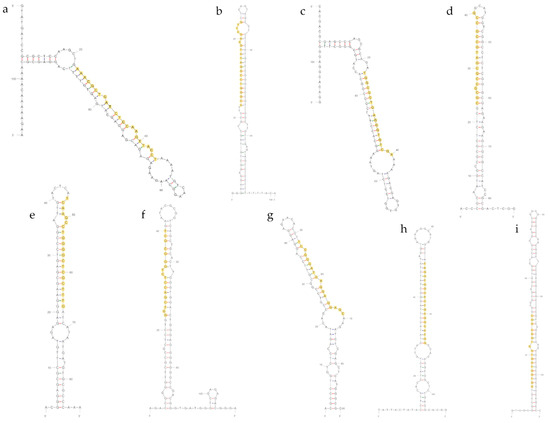 Prediction of the V. nonalfalfae precursor secondary structures; (a)—vna-miR-1, (b)—vna-miR-2, (c)—vna-miR-3, (d)—vna-miR-4, (e)—vna-miR-5, (f)—vna-miR-6, (g)—vna-miR-7, (h)—vna-miR-8 and (i)—conserved-miR-7044; the mature milRNA sequence is highlighted in yellow.