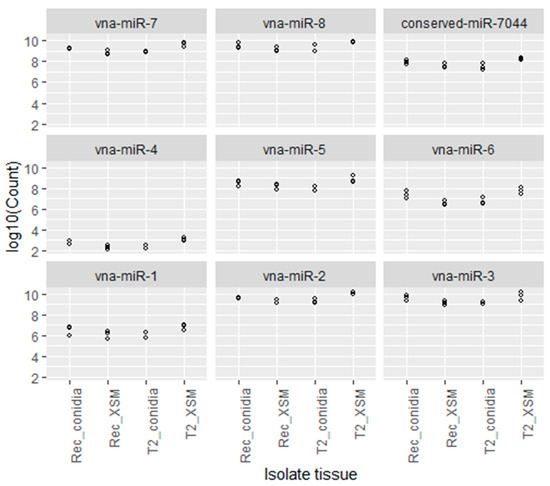 All nine V. nonalfalfae milRNAs were found to be expressed in all the investigated tissues of the two pathotypes; however, the most abundantly expressed milRNAs were vna-miR-2, vna-miR-3, vna-miR-7 and vna-miR-8 because they had the highest milRNA log10 copy numbers (Figure 2). In the highly virulent pathotype T2, the statistically significant (p < 0.001) highest expression of all the milRNAs was detected in mycelia grown in XSM, in which the mean count of the milRNA copy number was approximately two-fold greater than the mean count for conidia (Figure S4). On the other hand, in the less virulent Rec isolate, all the milRNAs were most abundantly expressed in conidia (Figure 2). The comparison of the milRNA copy number between isolates revealed that their mean count is two-fold higher in the mycelia of the T2 isolate than in the Rec isolate, indicating that in the highly virulent pathotype the investigated milRNAs are more abundantly expressed (Figure S4). In the conidia, the milRNAs were more abundantly expressed in the Rec isolate than in the T2 isolate.